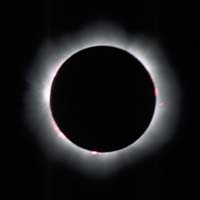 Our observations of the total solar eclipse near Shabla in northern Bulgaria were a total success. With a group of 2 Dutch, 1 Canadian, 4 Bulgarian and 7 German amateur astronomers we were at a lonesome gravel path at 43°32'21" N and 28°33'59" E. The sky was totaly clear without any cloud. The corona was a typical maximum one with streamers in all directions. Also some bright prominences could be seen. Here are the first images with the 500 mm and 1100 mm telelenses. |