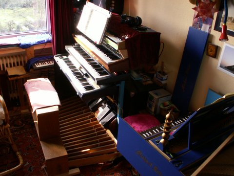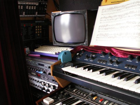 mit drei Behringer-Mischpulten, 8 Synthesizern (Korg Trident MK2, Korg