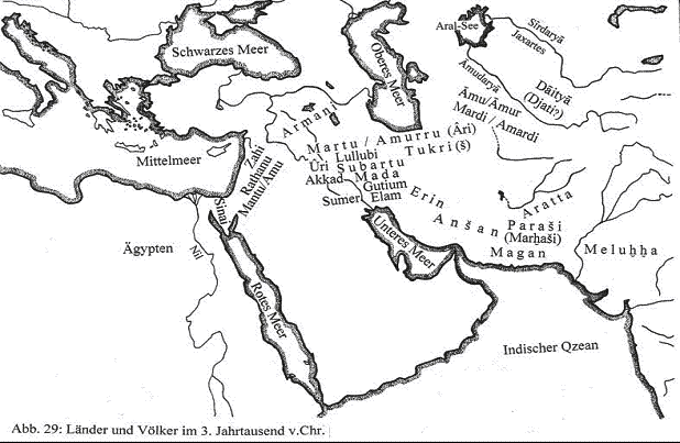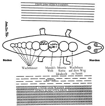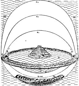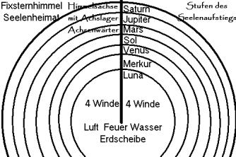 [4027] Meissner 1925,109, cf 107ff Schaubild mit den drei Himmeln über der Scheibenerde und den zwei Ebenen der Unterwelt. Zum Himmelsgewölbe, seinen Wächtern, den Ruheplätzen der Hauptgötter und den Sternregenten für jeden Monat und den beiden Himmel-Türen links und rechts cf aaO 179f. Das Schaubild habe ich in 2.1.4.5 übernommen.