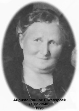 Auguste* Pauline Elwenspoek [Eltern] [Bild] wurde am 14. Januar 1861 in Sanditten (Kr. Wehlau) geboren 1. Sie erhielt am 18. Januar 1861 in Petersdorf die Kleinkindtaufe 2. Sie starb am 30. April 1947 in Friedland 3. Sie heiratete Friedrich Wilhelm* Meiert am 19. Februar 1886 in Petersdorf 4. Sie verlobten sich 1881 in Sanditten 5. Auguste* wohnte 1912 in Marienbruch (Kr. Labiau). 6 Sie wohnte 1941 in Königsberg (Ostpr.), Kaporner Str. 26. 7 Sie wohnte 1947 in Gehren (Kr. Neubrandenburg).