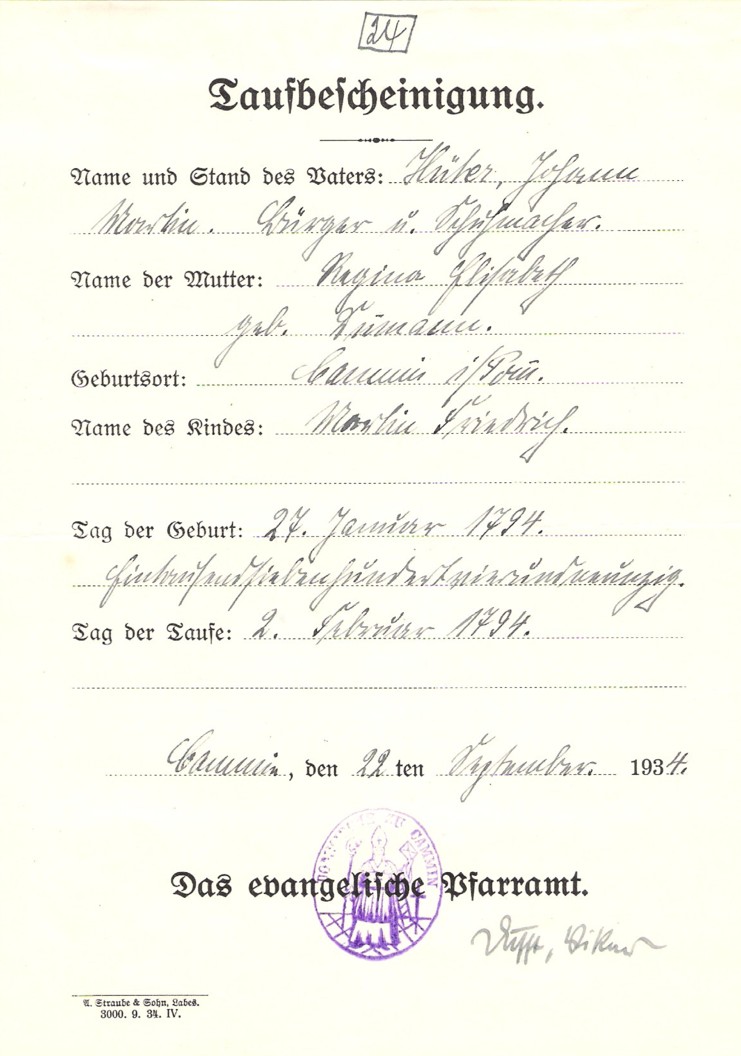 Martin Friedrich* Hüter [Eltern] [Bild] wurde am 27. Januar 1794 in Cammin geboren 1. Er erhielt am 2. Februar 1794 in Cammin, Domgemeinde die Kleinkindtaufe 2. Er starb am 22. Februar 1860 in Cammin 3. Die Todesursache war "Krampf". Er wurde am 26. Februar 1860 bestattet. Er heiratete Caroline Sophia Friederika* Wergin am 21. Juli 1816 in Cammin, Domgemeinde 4. Er arbeitete 1816 in Cammin als Bürger und Schuhmachermeister.